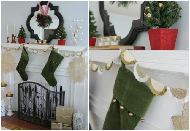Do we ever really out grow the love of glitter? Remember those little rectangular plastic containers of glitter in elementary school? I vividly recall resisting every urge in my 7 year-old self that wanted to dump the whole thing on my paper. This love of glitter morphed into an obsession of all things metallic a few decades later. Well, unlike Jonathan Adler metallic home interior pieces, glitter is cheap these days. Since the latter fits the budget much better than the former, I “splurged” on all the glittery paper Hobby Lobby had in stock and made a garland for my mantel this year.