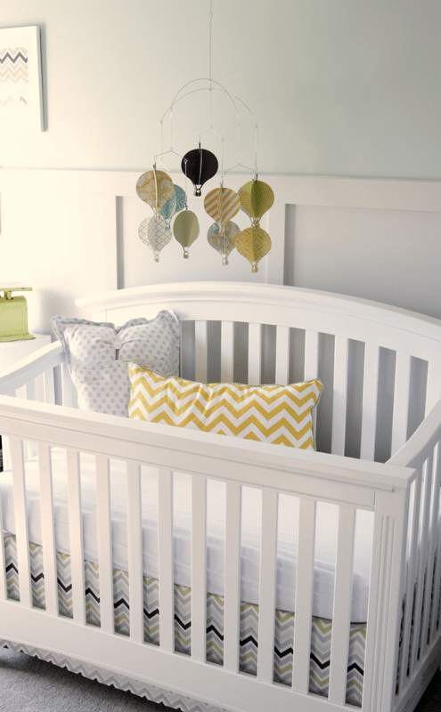 Aww what a pretty nursery!!! I love the hot air balloon mobile!! The zig zags are beautiful! Love the yellow scale!!