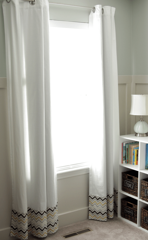 After searching all over the web (and calling to complain a time or two), Tanya couldn’t find any curtains that she really loved. Instead of settling, she purchased plain white panels from Target and then sewed a multi-colored chevron print to the bottom of each panel as well as her crib skirt. The left over fabric was used to line the back of the book shelves.