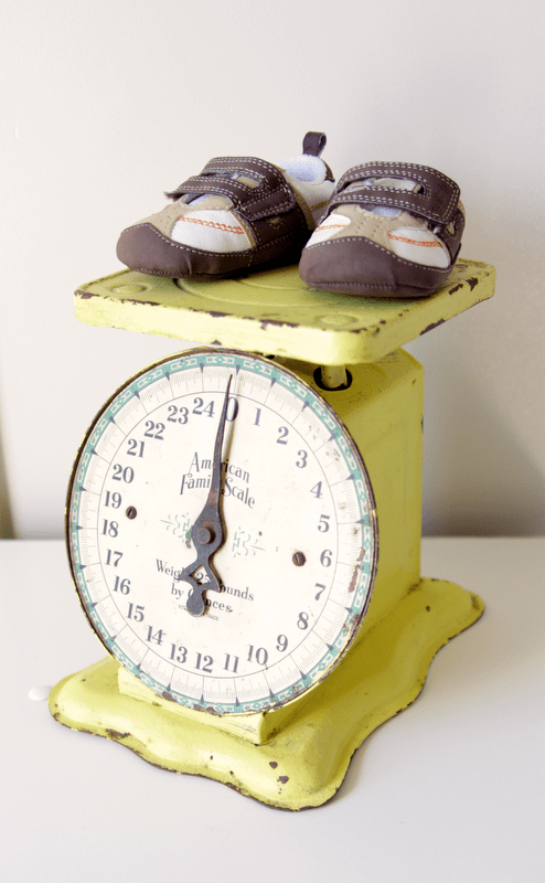 Me holding Greyson with my “Do I look I know what I’m doing holding a baby?” face. Meanwhile, Greyson’s making his, “Mom, this lady doesn’t have a clue” face.Question for those of you with kids…Tanya’s must-have item was the little yellow scale. What was your “must have” for a nursery?