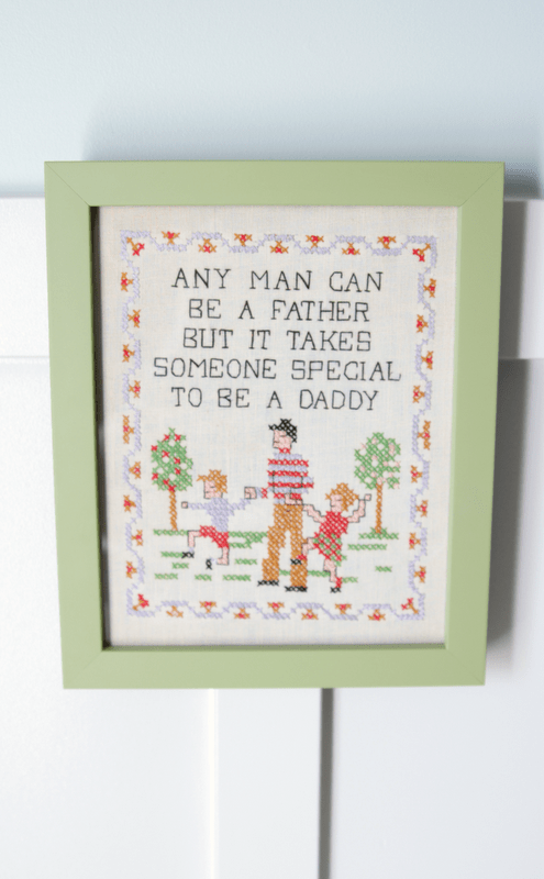 She obsessed over this vintage yellow scale found at one our local flea markets for weeks. After “stalking” it for a while, she finally decided it was worth the splurge. The precious needle work was actually hanging in her husband’s nursery when he was a baby. It’s probably my favorite thing in the entire room…Jonathan, her husband, created the faux board and batten himself. This was his first attempt at a project like this, and it looks even better in person that in pics. Can you IMAGINE the patience that took??